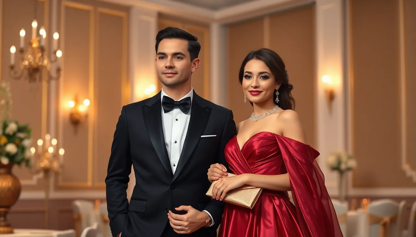- Tuxedo: A classic choice for men, featuring a black jacket with satin lapels and matching trousers, paired with a white dress shirt and black bow tie.